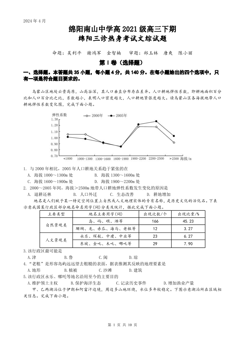 四川省绵阳南山中学2024届高三下学期4月绵阳三诊热身考试文综