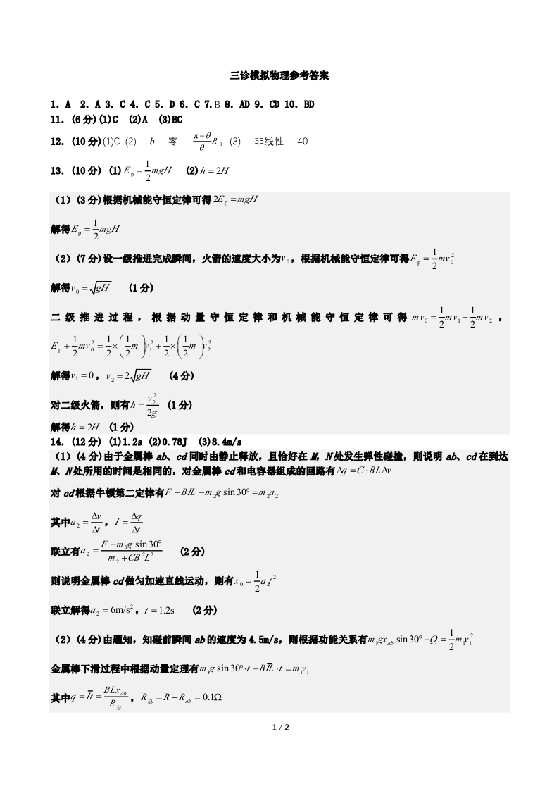 四川省成都市第七中学2024~2025学年度下期高2025届三诊模拟考试物理答案
