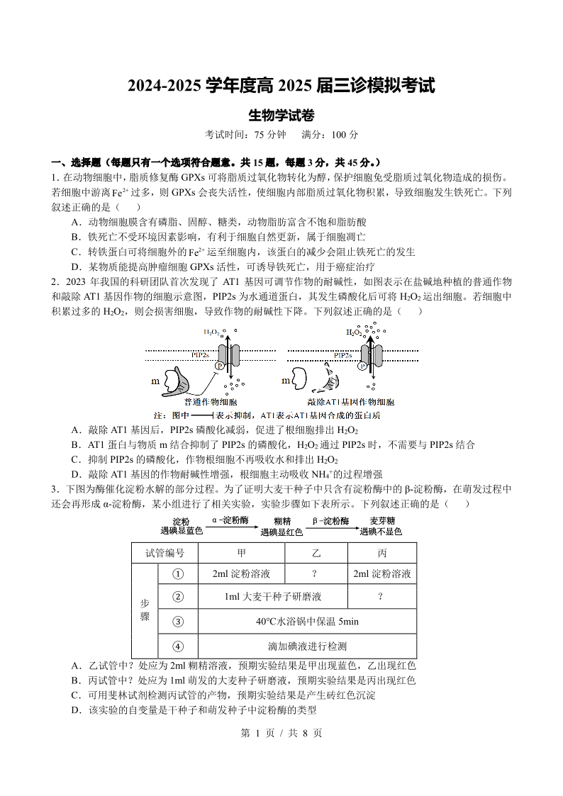 四川省成都市第七中学2024~2025学年度下期高2025届三诊模拟考试生物