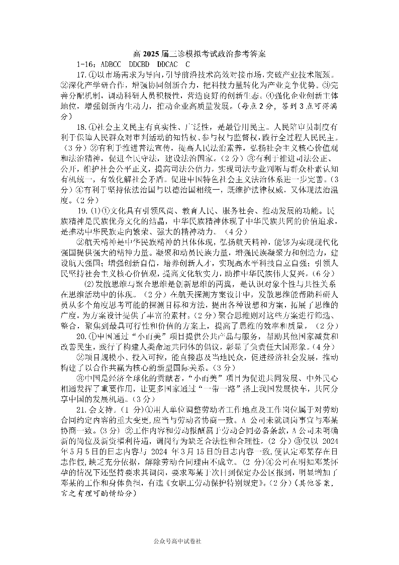 四川省成都市第七中学2024~2025学年度下期高2025届三诊模拟考试政治答案