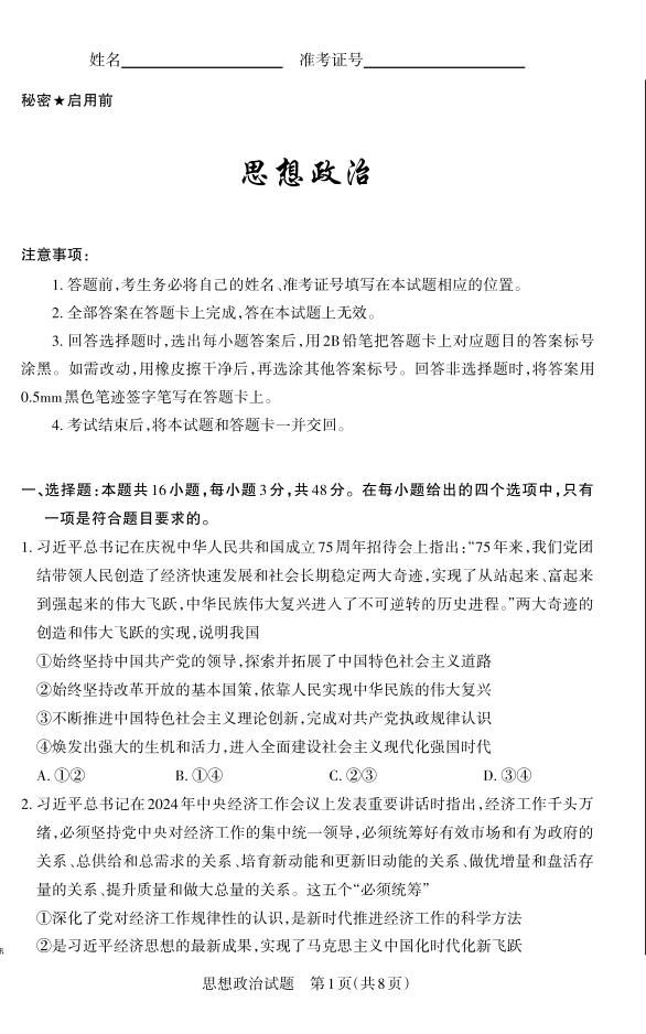 山西省思而行2024-2025学年下学期高三二模适应性测试政治