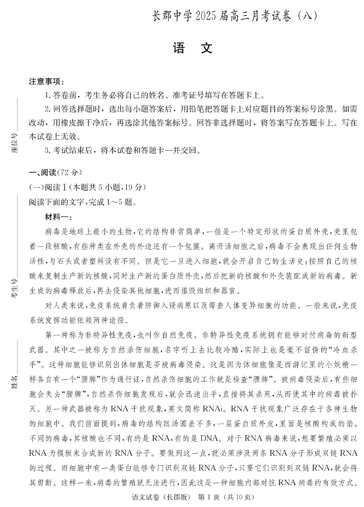 湖南省长郡中学2024-2025学年下学期高三月考(八)语文