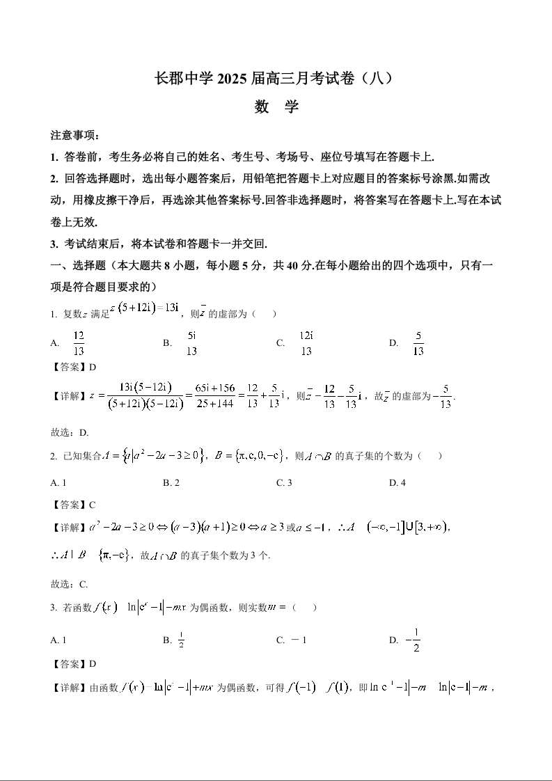 湖南省长郡中学2024-2025学年下学期高三月考(八)数学(解析版)