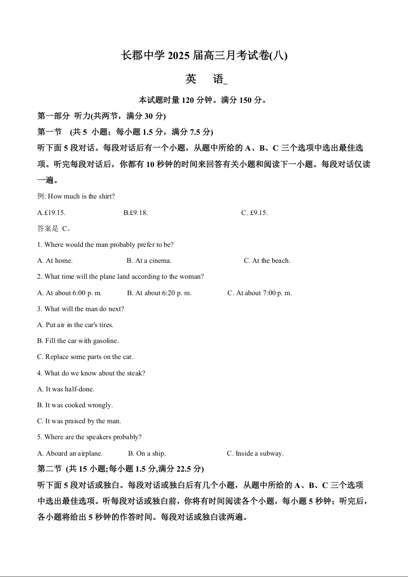 湖南省长郡中学2024-2025学年下学期高三月考(八)英语+答案