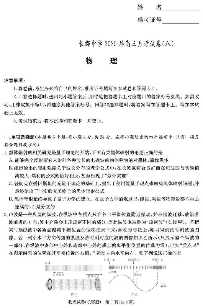 湖南省长郡中学2024-2025学年下学期高三月考(八)物理