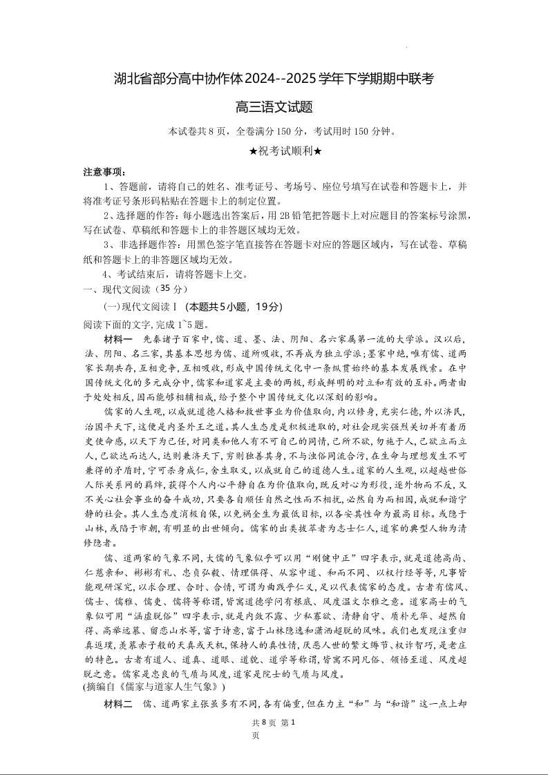 湖北省高中协作体2024-2025学年下学期4月高三期中联考语文