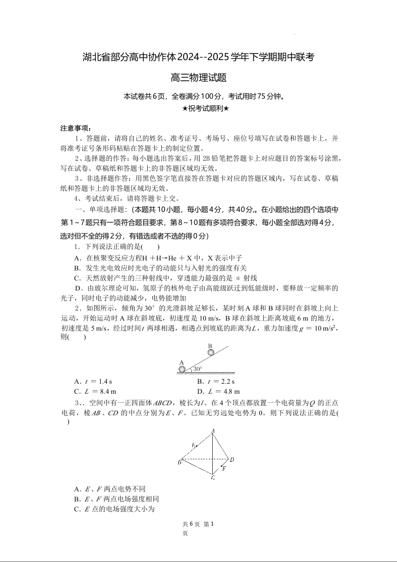 湖北省高中协作体2024-2025学年下学期4月高三期中联考物理