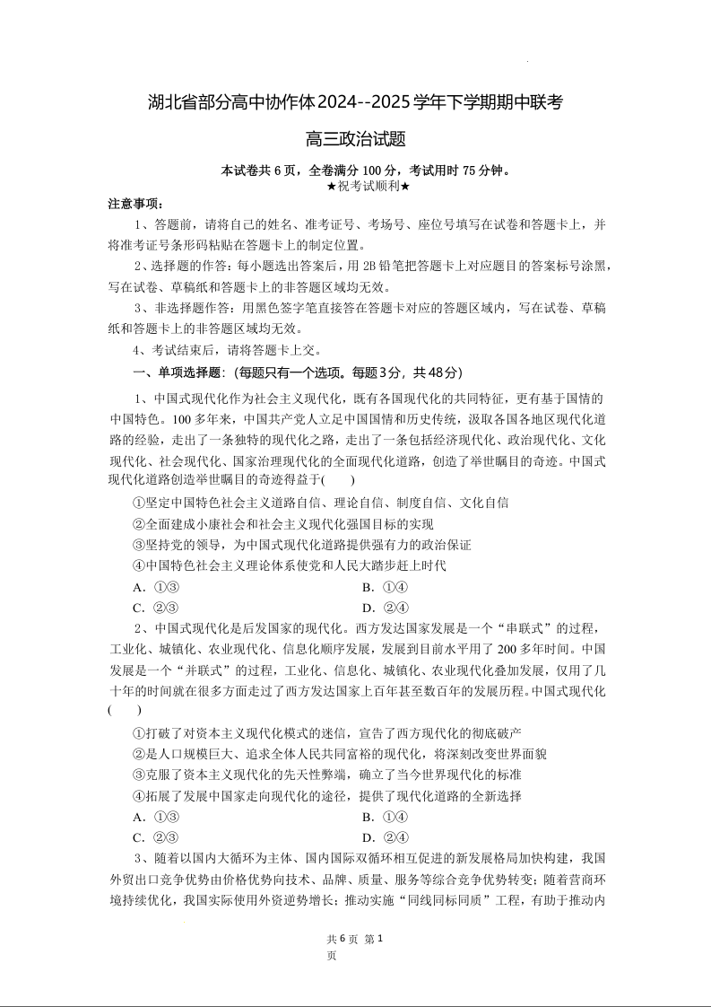 湖北省高中协作体2024-2025学年下学期4月高三期中联考政治