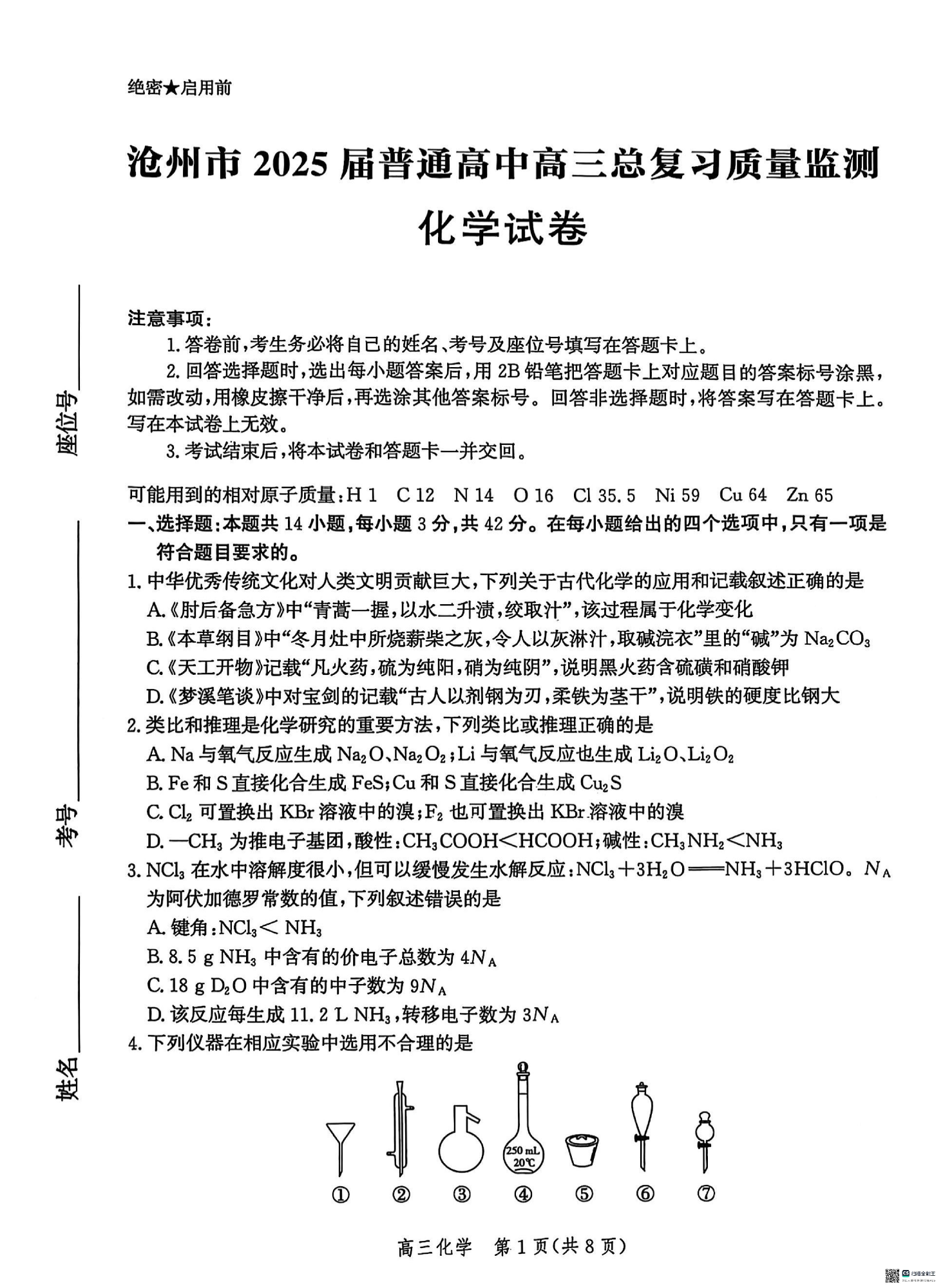 河北省沧州市2024-2025学年下学期4月高三二模质量监测化学+答案