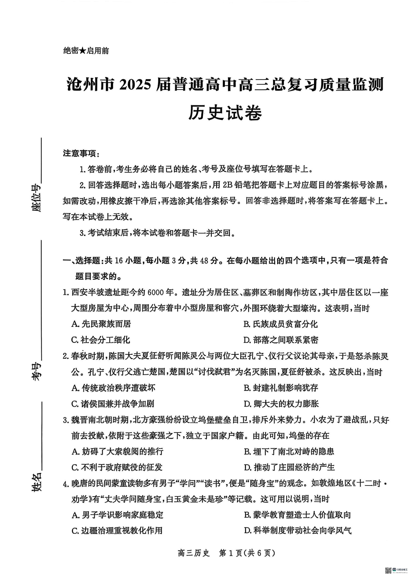 河北省沧州市2024-2025学年下学期4月高三二模质量监测历史+答案
