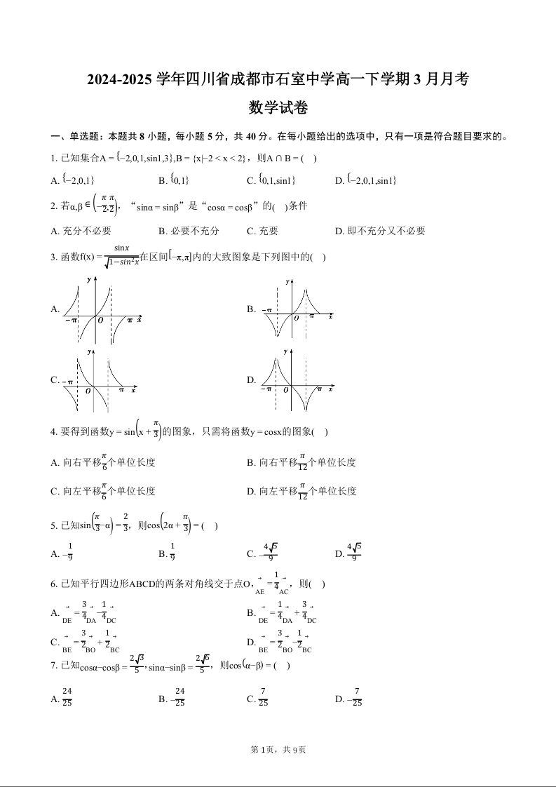 四川省成都市石室中学2024-2025学年下学期3月高一月考数学+答案