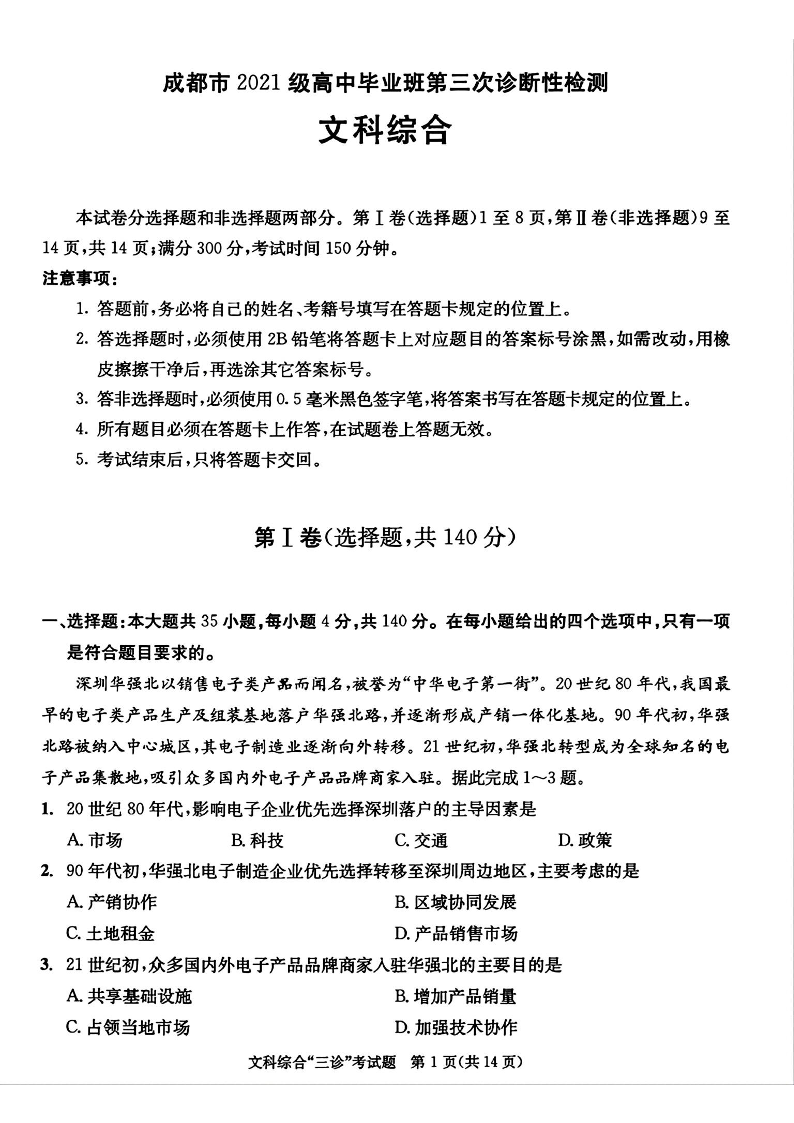 四川省成都市2024届高三下学期第三次诊断性检测(成都三诊)文综