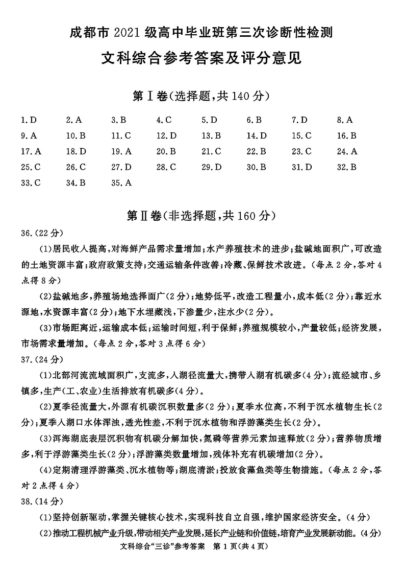 四川省成都市2024届高三下学期第三次诊断性检测(成都三诊)文综答案