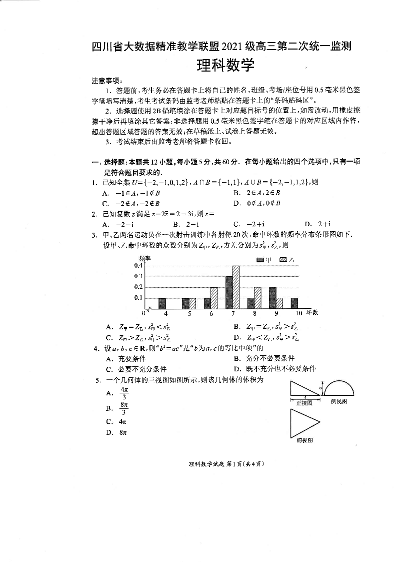 四川省大数据精准教学联盟2021级(2024届)高三年级第二次统一监测(大数据二统)理科数学