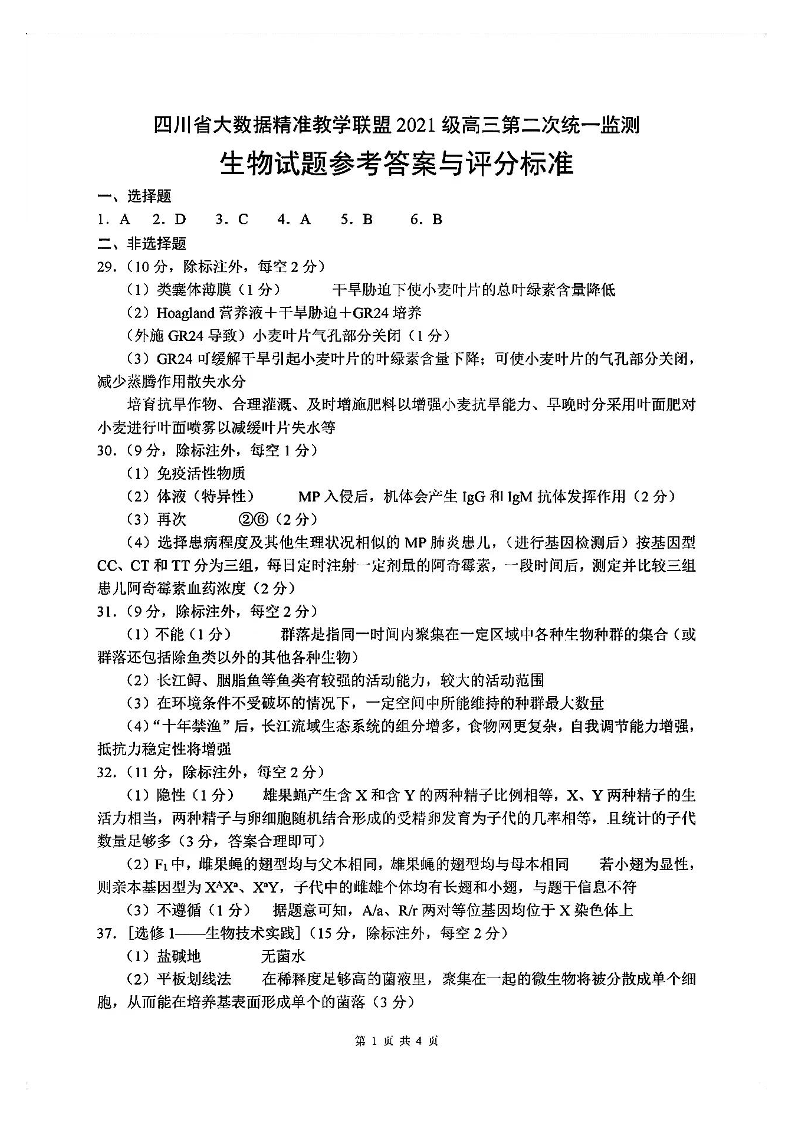 四川省大数据精准教学联盟2021级(2024届)高三年级第二次统一监测(大数据二统)理综答案
