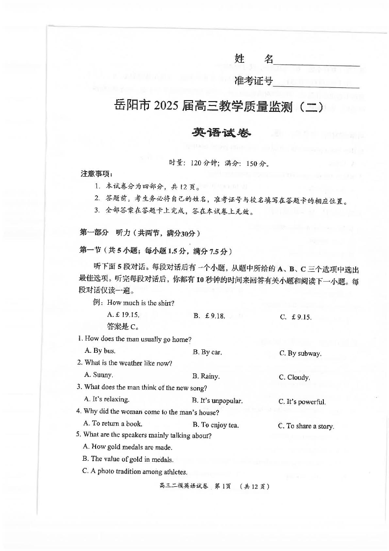 湖南省岳阳市2024-2025学年下学期高三二模教学质量监测英语+答案