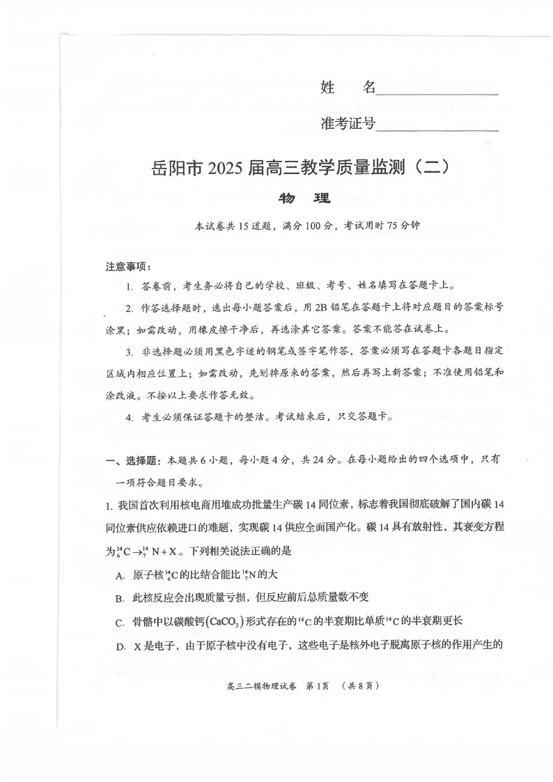 湖南省岳阳市2024-2025学年下学期高三二模教学质量监测物理