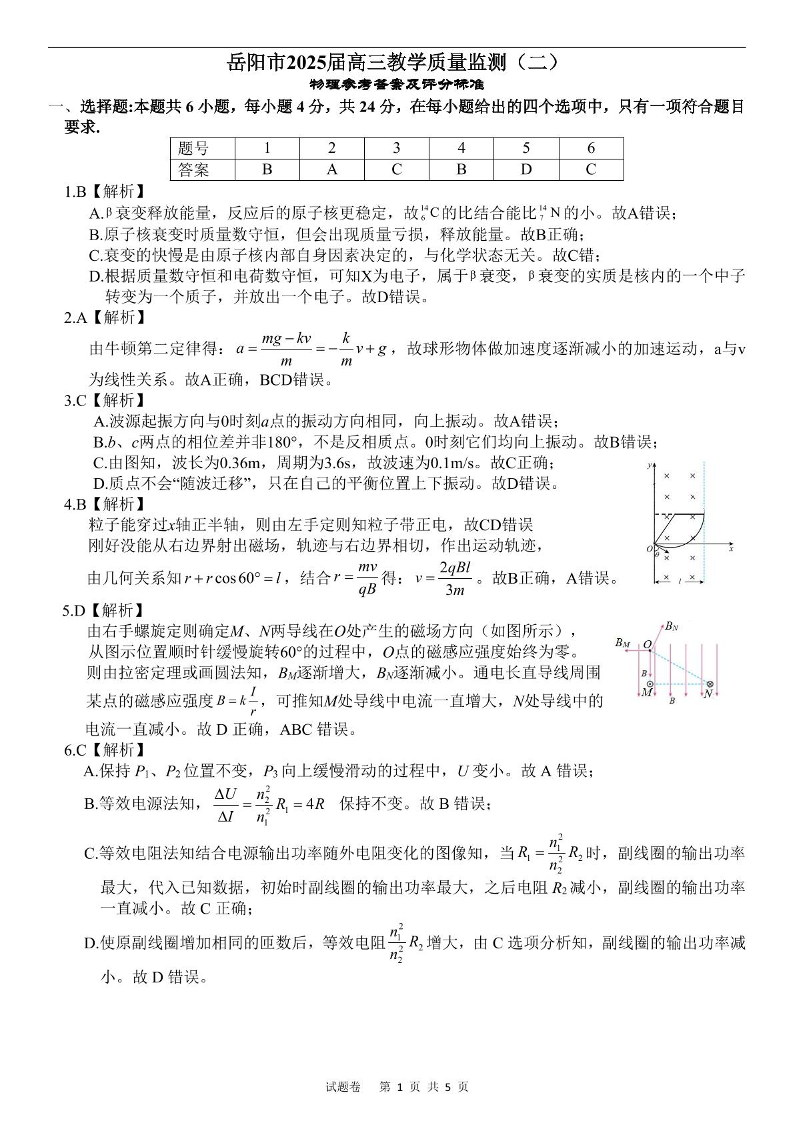 湖南省岳阳市2024-2025学年下学期高三二模教学质量监测物理答案