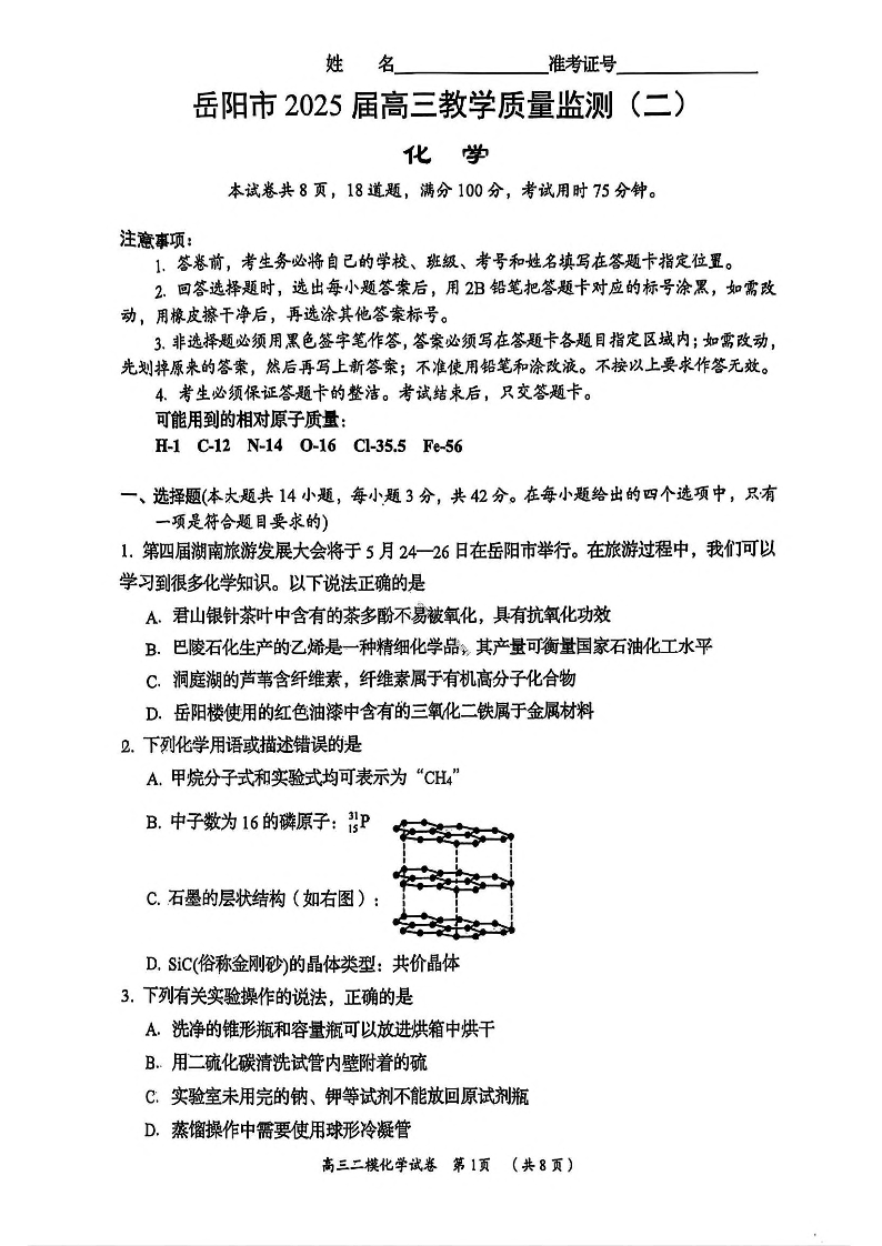 湖南省岳阳市2024-2025学年下学期高三二模教学质量监测化学+答案