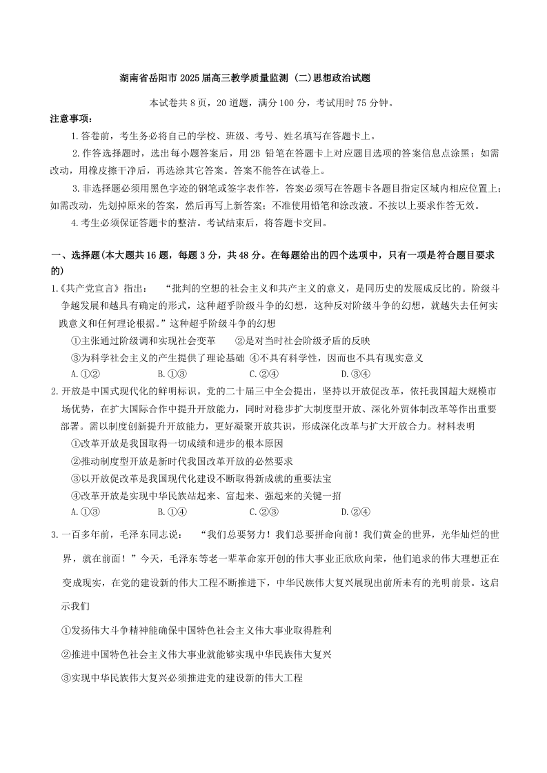 湖南省岳阳市2024-2025学年下学期高三二模教学质量监测政治+答案