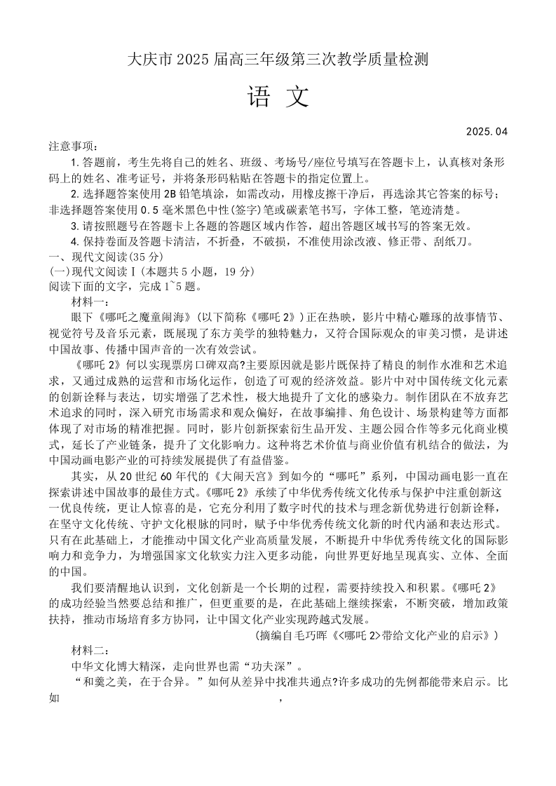 黑龙江省大庆市2024-2025学年下学期高三三模质量检测语文+答案