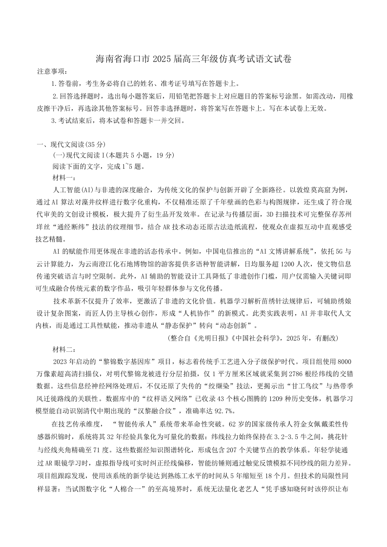 海南省海口市2024-2025学年下学期4月高三仿真考试语文+答案