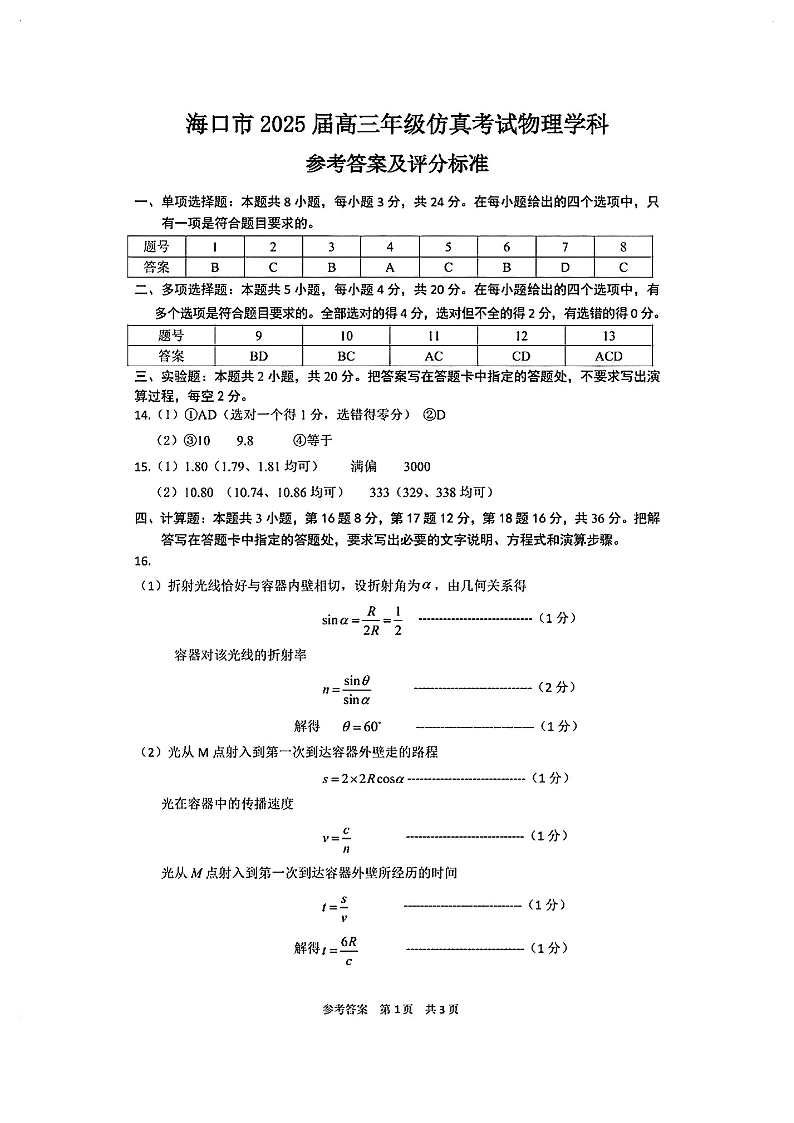 海南省海口市2024-2025学年下学期4月高三仿真考试物理答案
