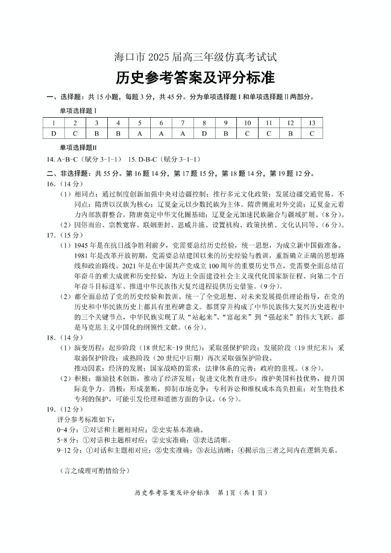海南省海口市2024-2025学年下学期4月高三仿真考试历史答案
