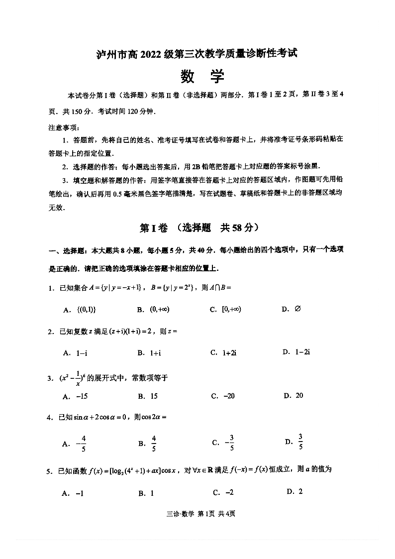 四川省泸州市2024-2025学年下学期高三第三次教学质量诊断性考试数学