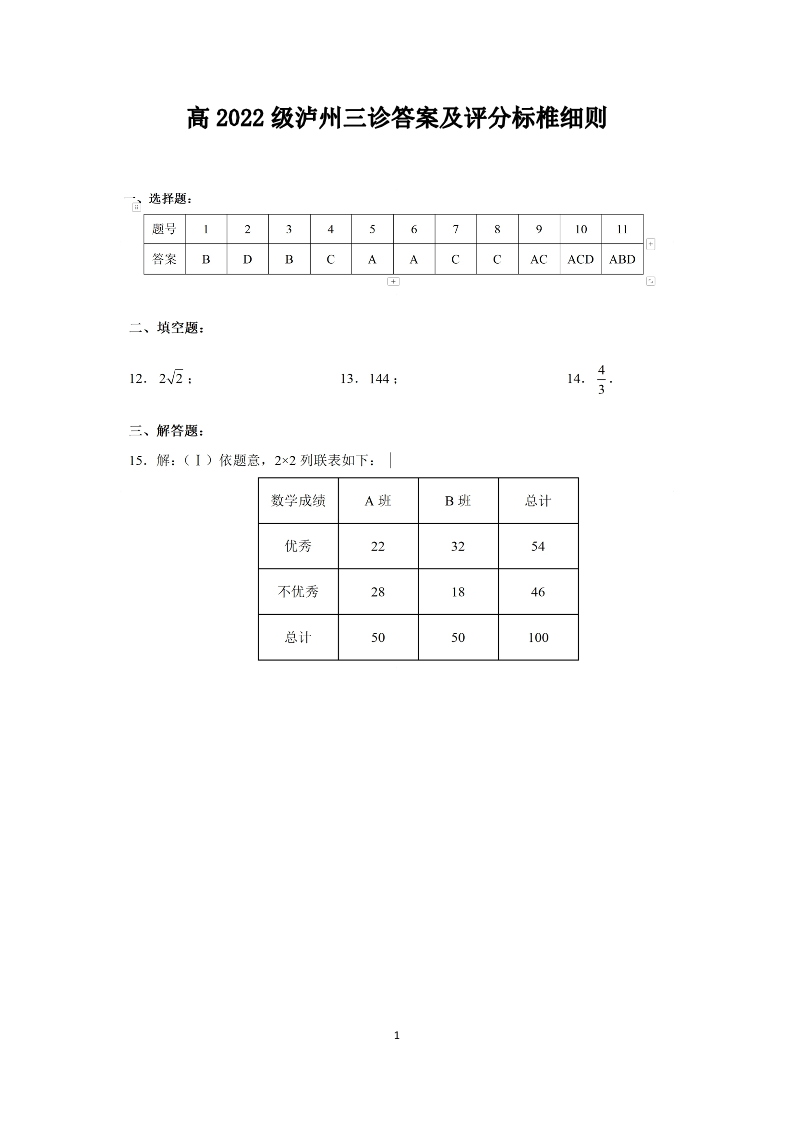 四川省泸州市2024-2025学年下学期高三第三次教学质量诊断性考试数学答案