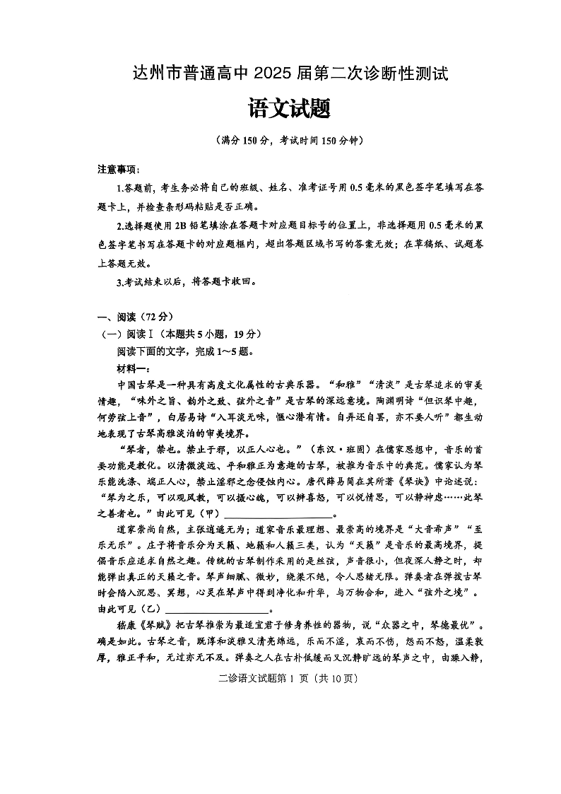 四川省达州市2024-2025学年下学期高三第二次诊断性测试语文