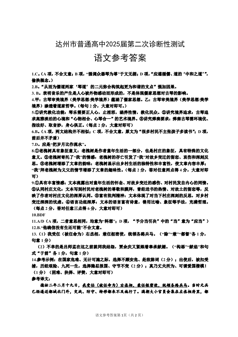 四川省达州市2024-2025学年下学期高三第二次诊断性测试语文答案