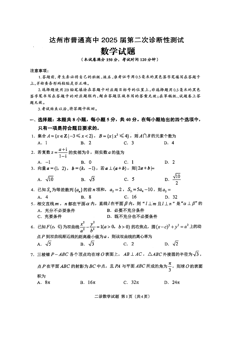 四川省达州市2024-2025学年下学期高三第二次诊断性测试数学