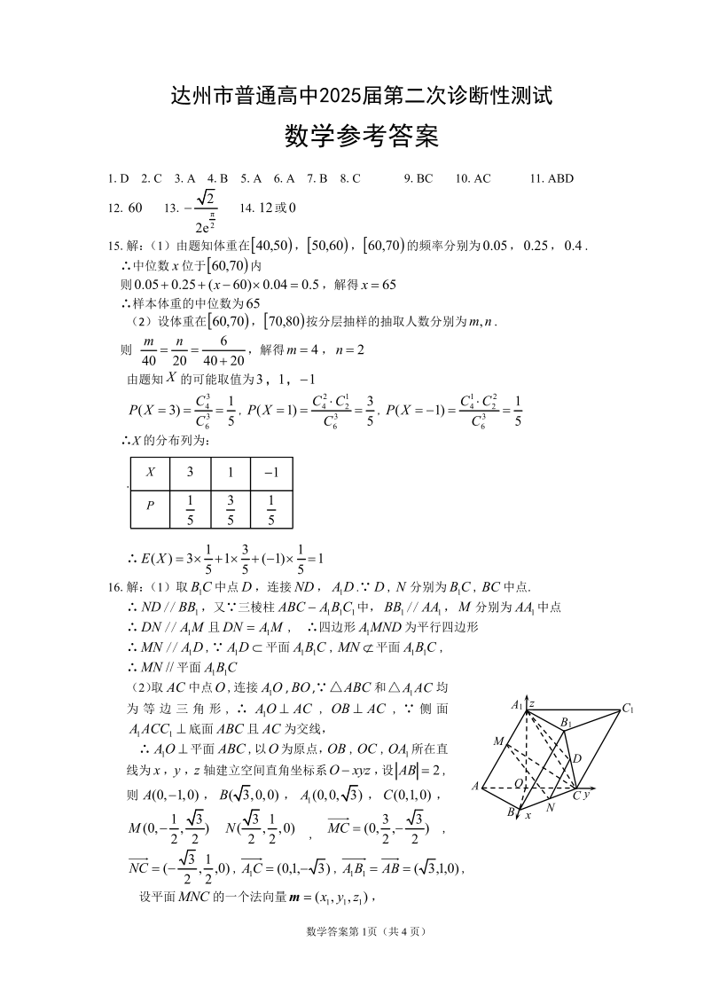 四川省达州市2024-2025学年下学期高三第二次诊断性测试数学答案