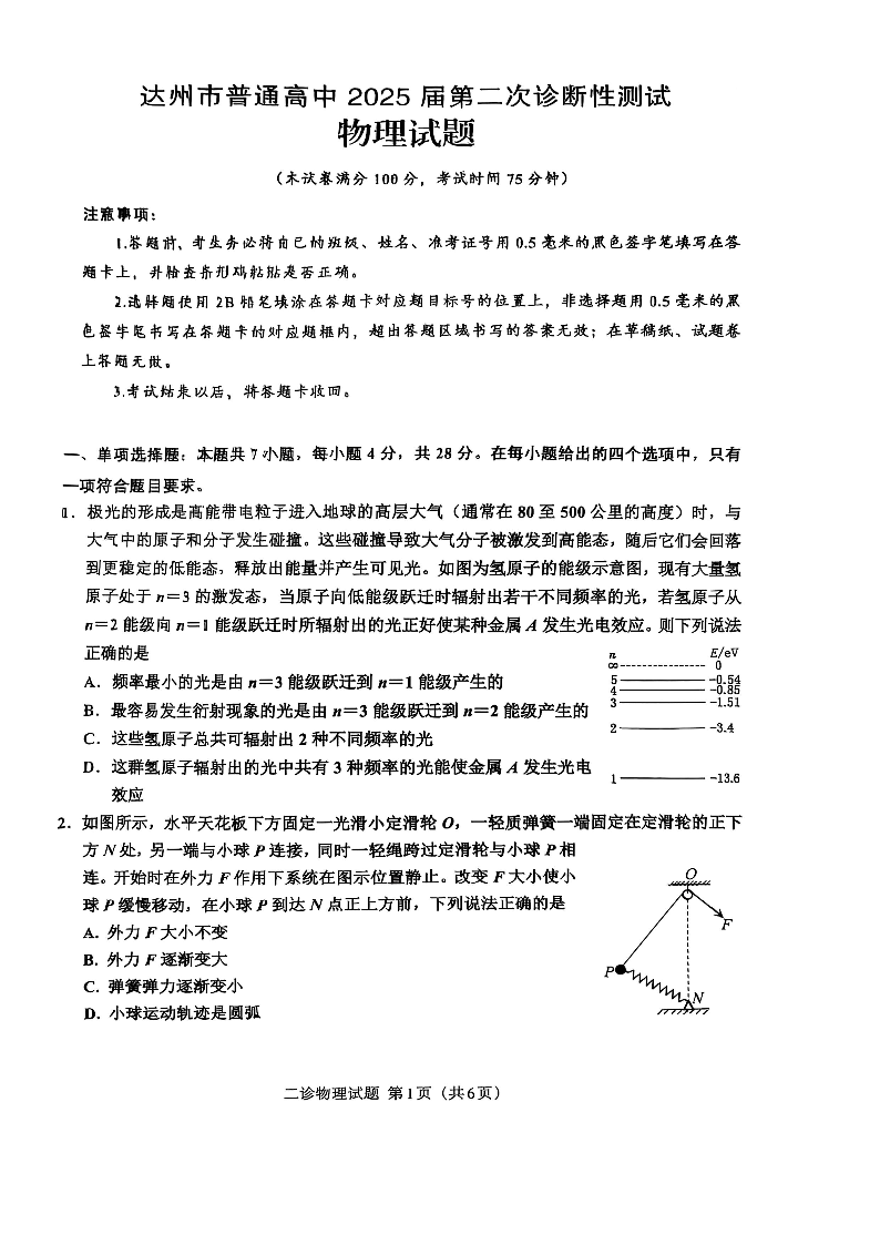 四川省达州市2024-2025学年下学期高三第二次诊断性测试物理