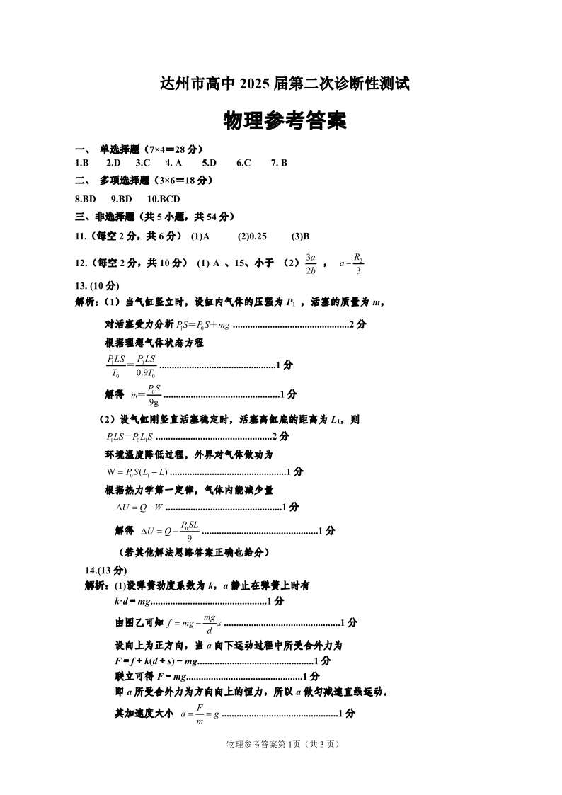 四川省达州市2024-2025学年下学期高三第二次诊断性测试物理答案