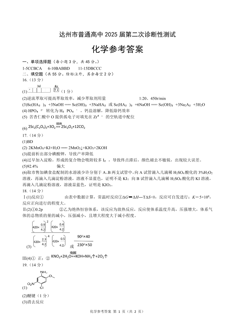 四川省达州市2024-2025学年下学期高三第二次诊断性测试化学答案