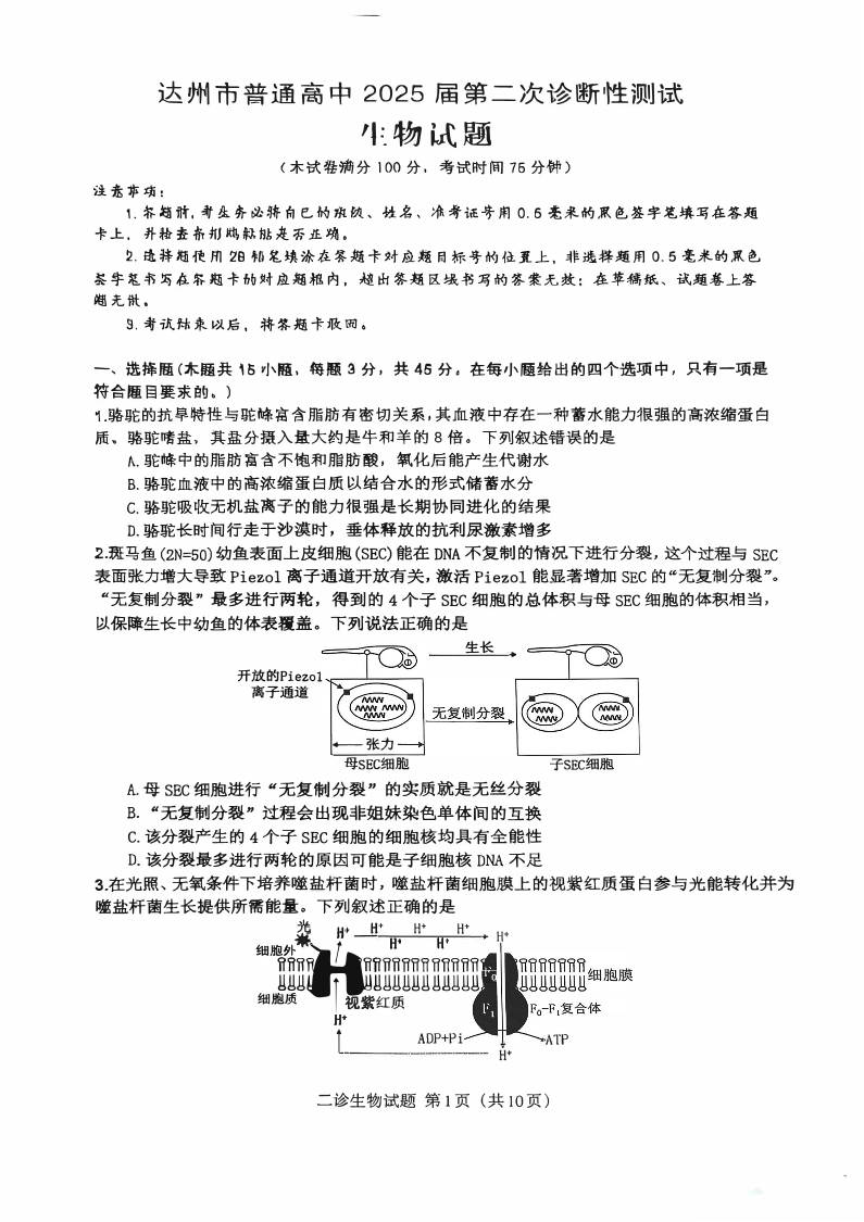 四川省达州市2024-2025学年下学期高三第二次诊断性测试生物
