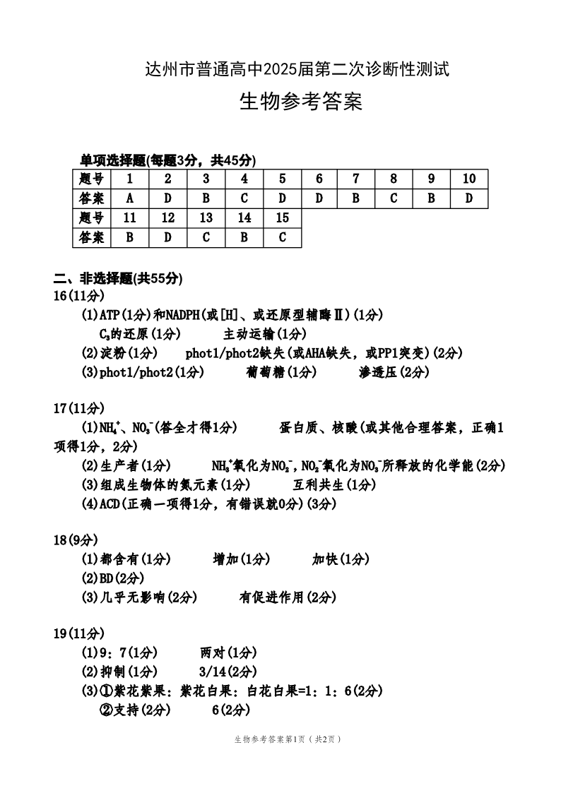 四川省达州市2024-2025学年下学期高三第二次诊断性测试生物答案