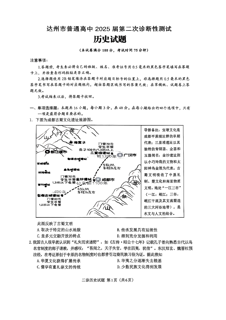 四川省达州市2024-2025学年下学期高三第二次诊断性测试历史