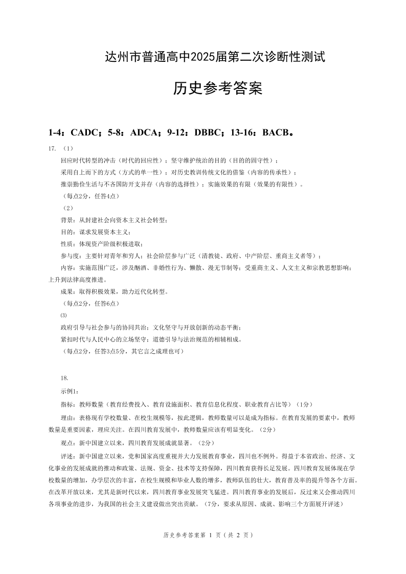 四川省达州市2024-2025学年下学期高三第二次诊断性测试历史答案