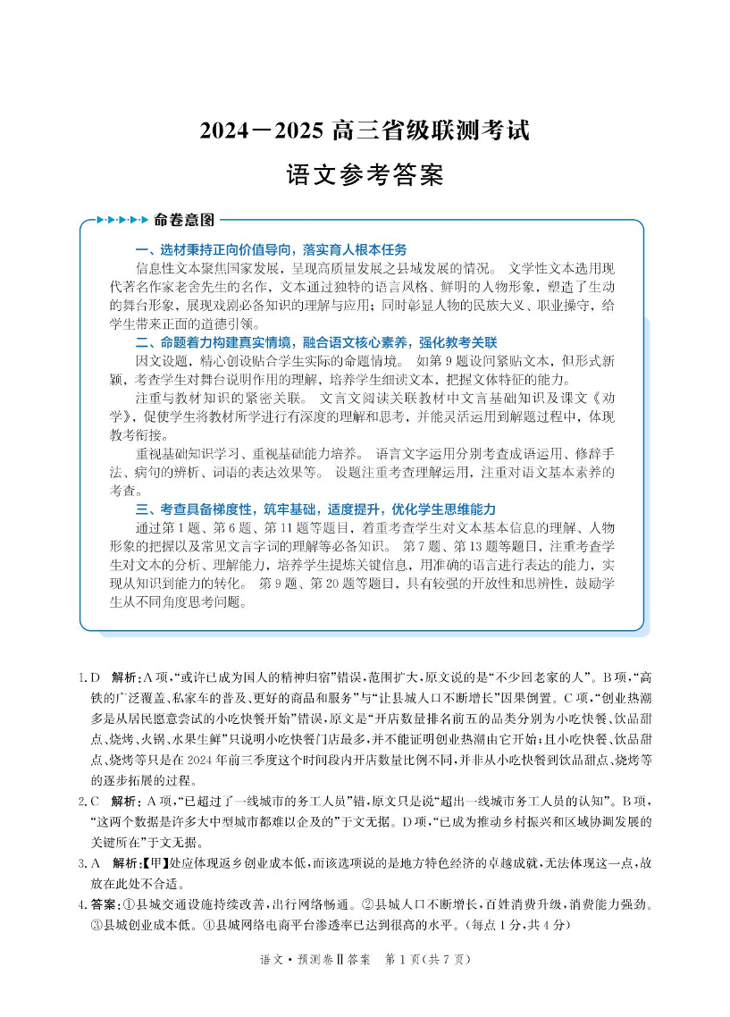 河北省部分高中2024-2025学年下学期4月高三省级联测考试语文答案