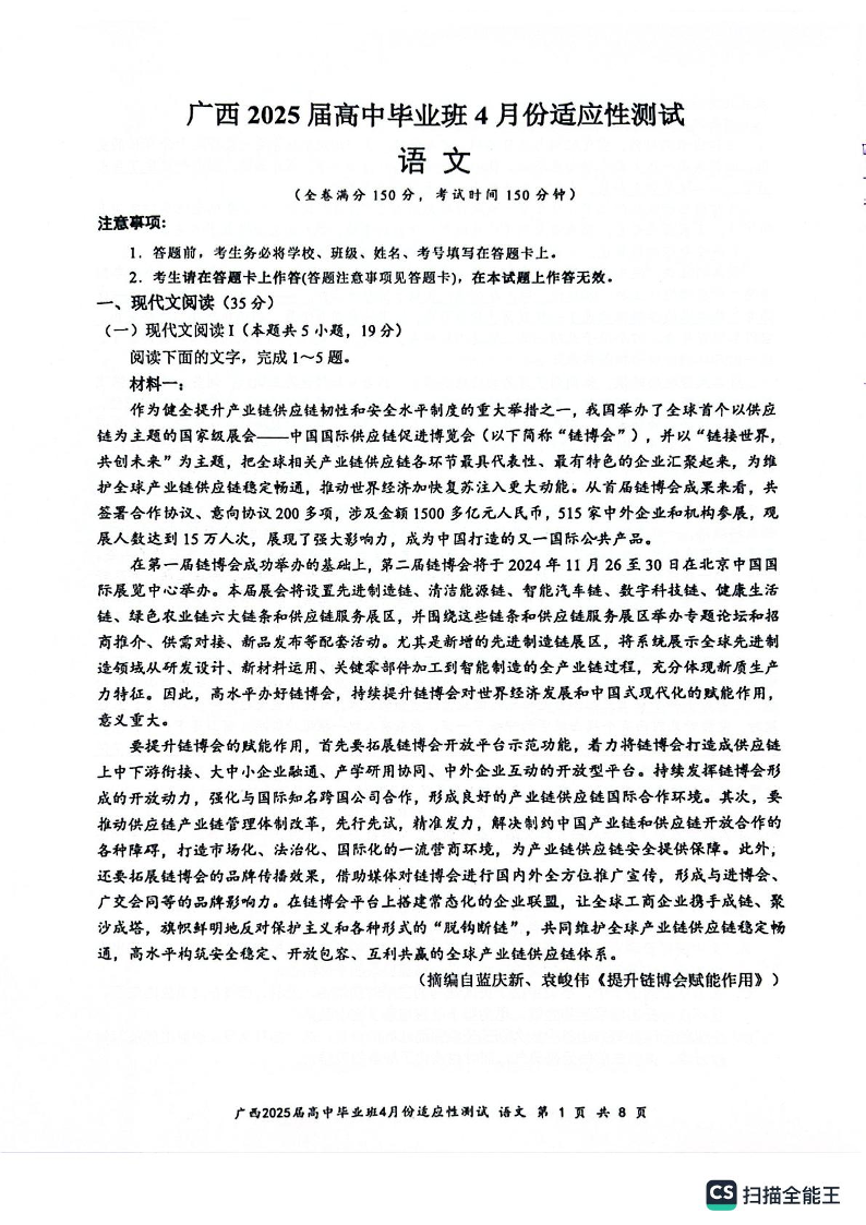 广西壮族自治区2024-2025学年下学期4月高三高考适应性测试语文