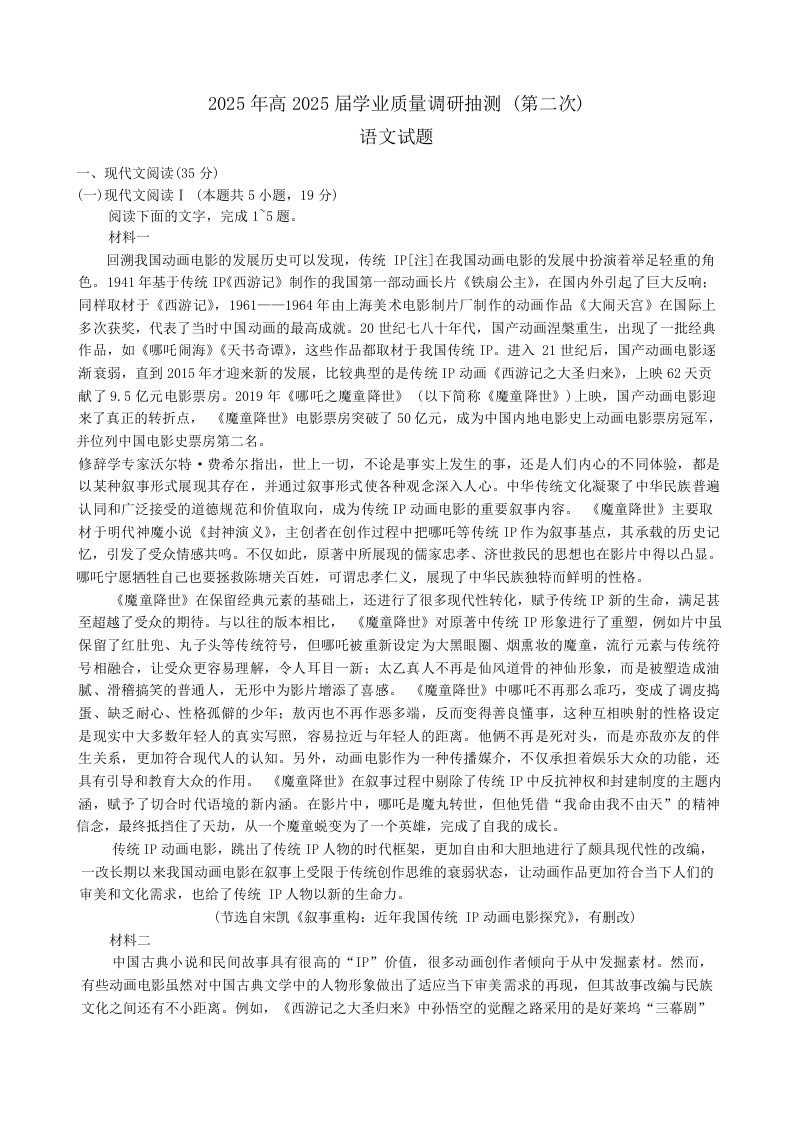 重庆市主城五区2024-2025学年下学期高三二诊质量调研抽测语文