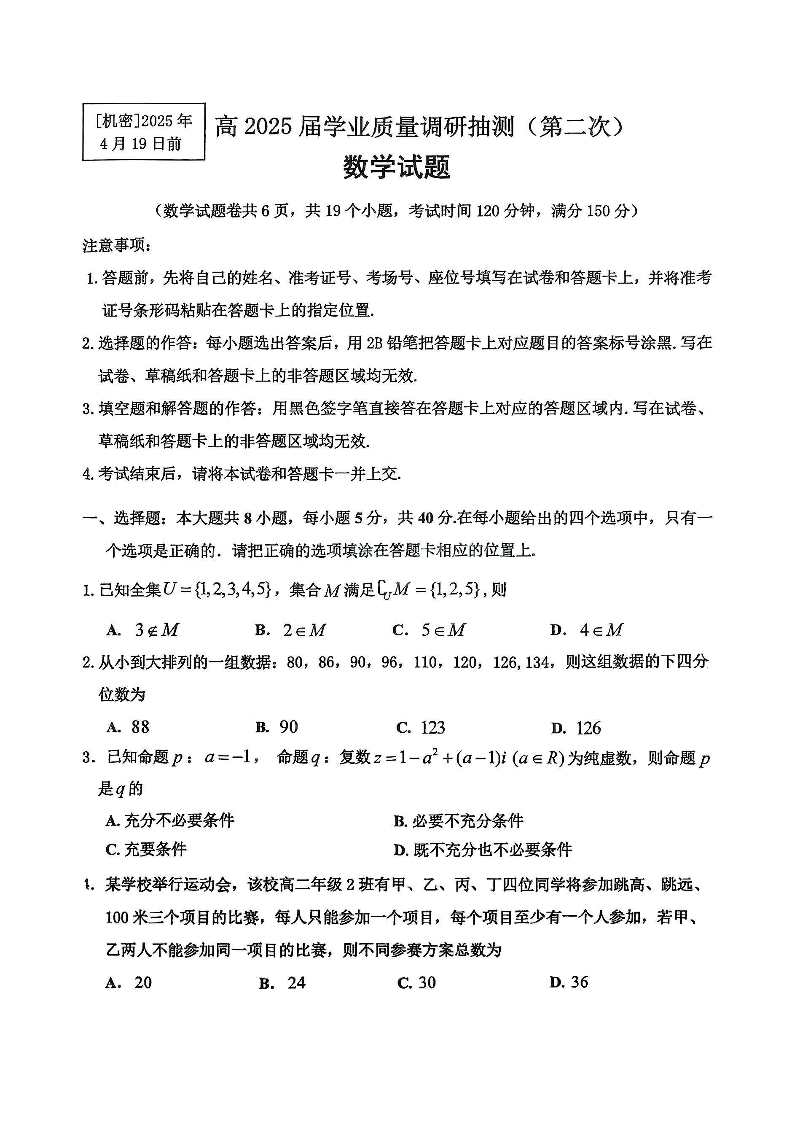 重庆市主城五区2024-2025学年下学期高三二诊质量调研抽测数学