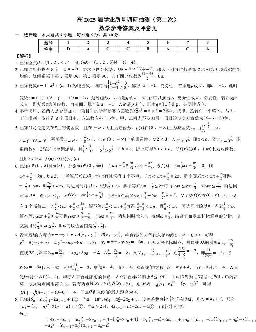 重庆市主城五区2024-2025学年下学期高三二诊质量调研抽测数学解析