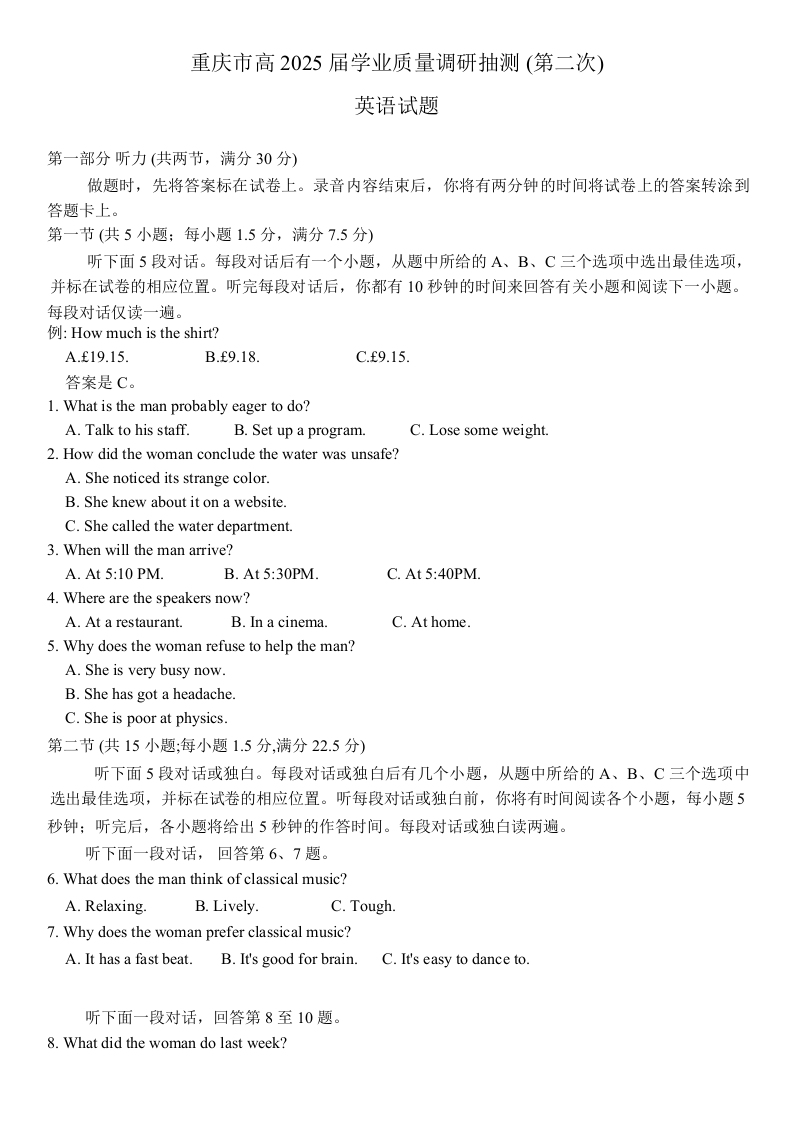 重庆市主城五区2024-2025学年下学期高三二诊质量调研抽测英语