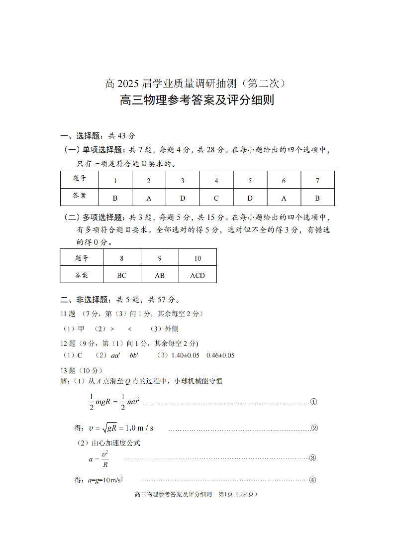 重庆市主城五区2024-2025学年下学期高三二诊质量调研抽测物理答案