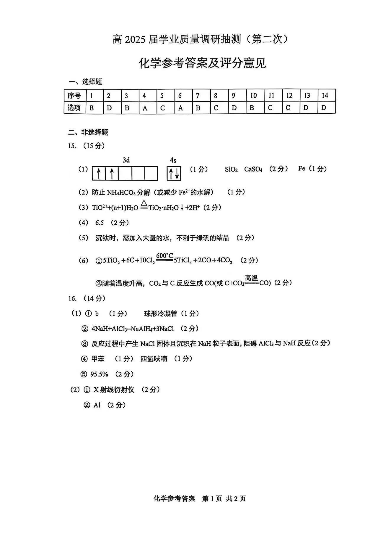 重庆市主城五区2024-2025学年下学期高三二诊质量调研抽测化学答案