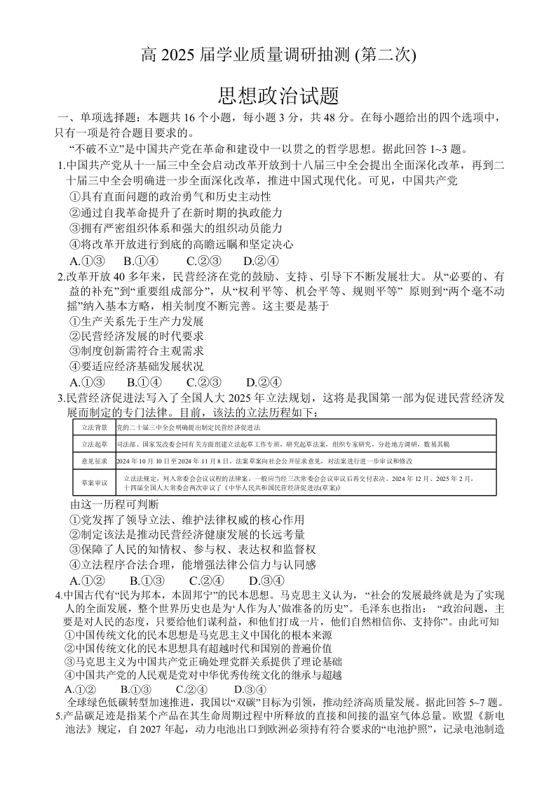 重庆市主城五区2024-2025学年下学期高三二诊质量调研抽测政治